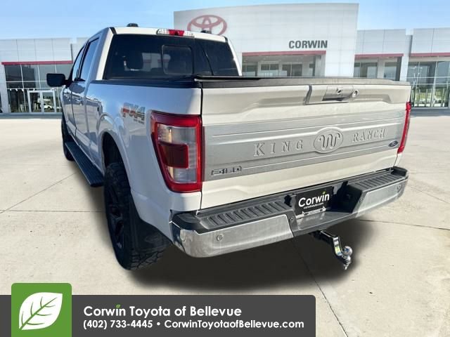 Featuring a lift kit, black aftermarket wheels, and mud tires, our bold 2021 Ford F-150 King Ranch SuperCrew 4X4 with the Trailer Tow and 360 Degree Camera Packages in Star White is a hard worker with a high level of luxury! Powered by a 5.0 Liter V8 offering 400hp paired to a 10 Speed SelectShift Automatic transmission for confident road authority. Backed by impressive payload and trailer ratings, this Four Wheel Drive truck also handles well and achieves nearly 22mpg on the highway while dressed up with an upscale look and sophisticated details. Get ready to get noticed with LED lighting, fog lamps, two-tone paint treatment, heated power-folding mirrors, alloy wheels, and a high-strength bed with the BoxLink cargo-management system.