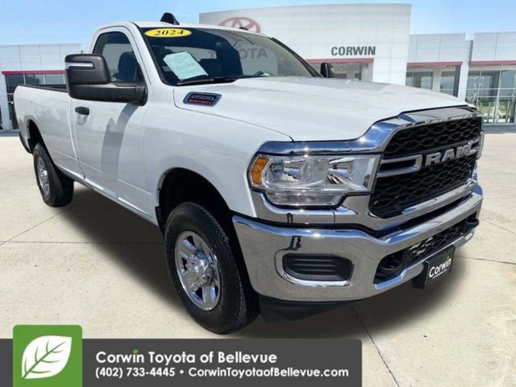 Built to conquer, our Accident Free, One Owner, Low Mileage 2024 RAM 2500 Tradesman Regular Cab 4X4 with Chrome Appearance Group is bold and commanding in Bright White! Powered by a 6.4 Liter HEMI V8 offering 410hp matched to an 8 Speed Automatic transmission for commercial-strength capability. This Four Wheel Drive truck inspires confidence with its robust suspension and turns heads with its rugged appearance. Our RAM has a purposeful look enhanced by an LED hitch light with a Class V receiver hitch, telescoping mirrors, quad halogen headlights, and aggressive chrome bumpers and grille.