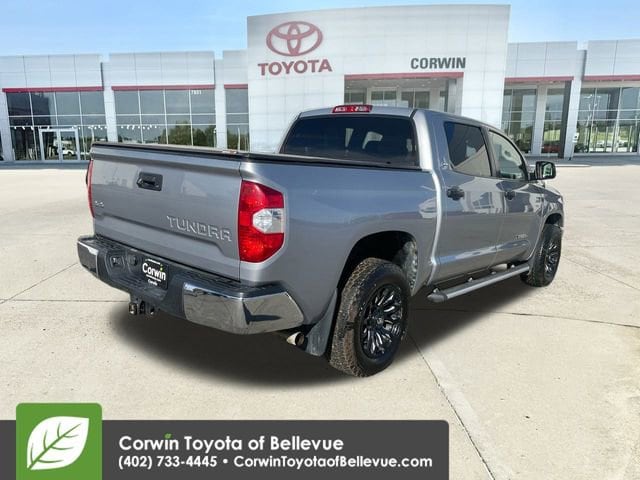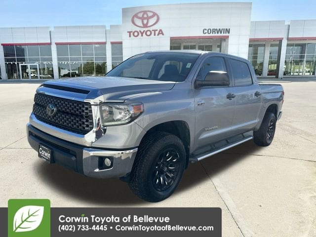 Our Accident Free, Low Mileage 2019 Toyota Tundra SR5 CrewMax 4X4 brought to you in Silver Sky Metallic offers just what you need in a truck! Powered by a 5.7 Liter iForce V8 that provides 381hp managed by a 6 Speed Automatic transmission. This Four Wheel Drive offers a fantastic ride and scores nearly 19mpg on the highway while showing off the chrome grille, fog lights, black aftermarket wheels, running boards, a drop-in bedliner, a tonneau cover, easy lower and lift tailgate, and daytime running lights of our SR5 that allow you to command the road.